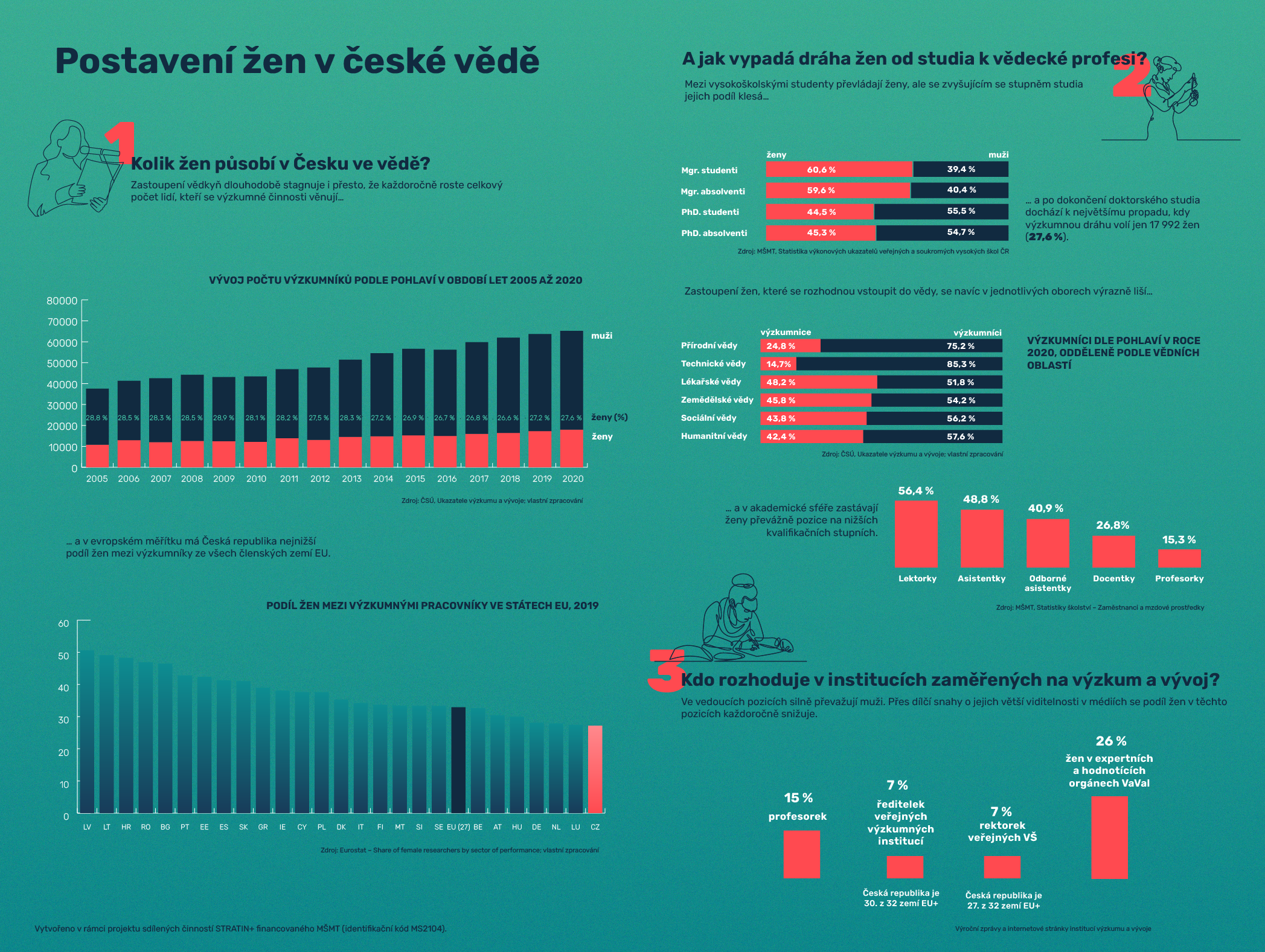 Národní kontaktní centrum – gender a věda vydalo Monitorovací zprávu o zastoupení žen ve vědě a výzkumu za rok 2020. V ní mapuje postavení žen ve vědě a inovacích v České republice. Zprávy vydává každoročně už od roku 2005. Zastoupení žen mezi výzkumníky po stagnaci posledních let mírně roste, v roce 2020 dosáhlo 27,6 %. I přes tento pozitivní vývoj se však jedná o jedno z nejnižších zastoupení žen. V evropském srovnání měla Česká republika nejnižší počet žen mezi výzkumníky ze všech členských zemí EU. Na úrovni EU si v tomto ohledu navíc nevede dobře dlouhodobě. Největší propad se stále objevuje mezi dokončením doktorského studia a nástupem do výzkumu a nedaří se ani měnit nízký podíl žen na vedoucích pozicích ve vědě a výzkumu. Zvyšuje se naopak podíl žen mezi specialisty ve vědě a technice.